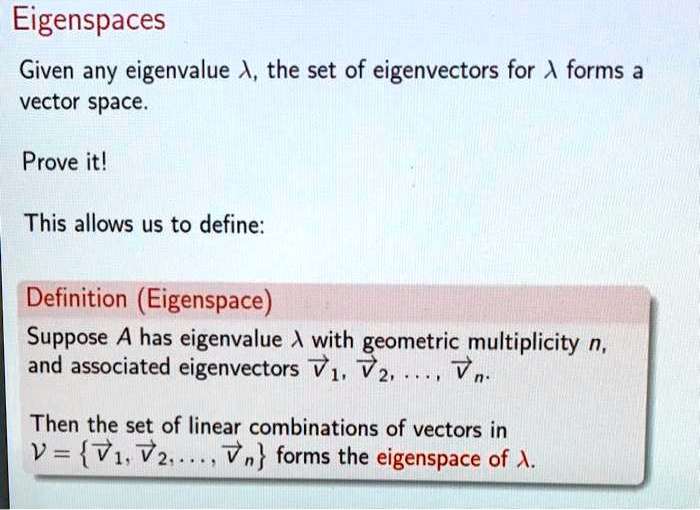 While eigenvectors are individual vectors with this special property, an eigenspace is a collection of these eigenvectors, along with the zero vector. Crucially, an eigenspace is not just a set of vectors; it’s a subspace. This means that if you take any two vectors within an eigenspace and add them together, the resulting vector will also be in that same eigenspace. Likewise, if you scale any vector in an eigenspace by any scalar number, the resulting vector will also belong to that eigenspace. This property arises directly from the definition of linear transformations and eigenvectors.