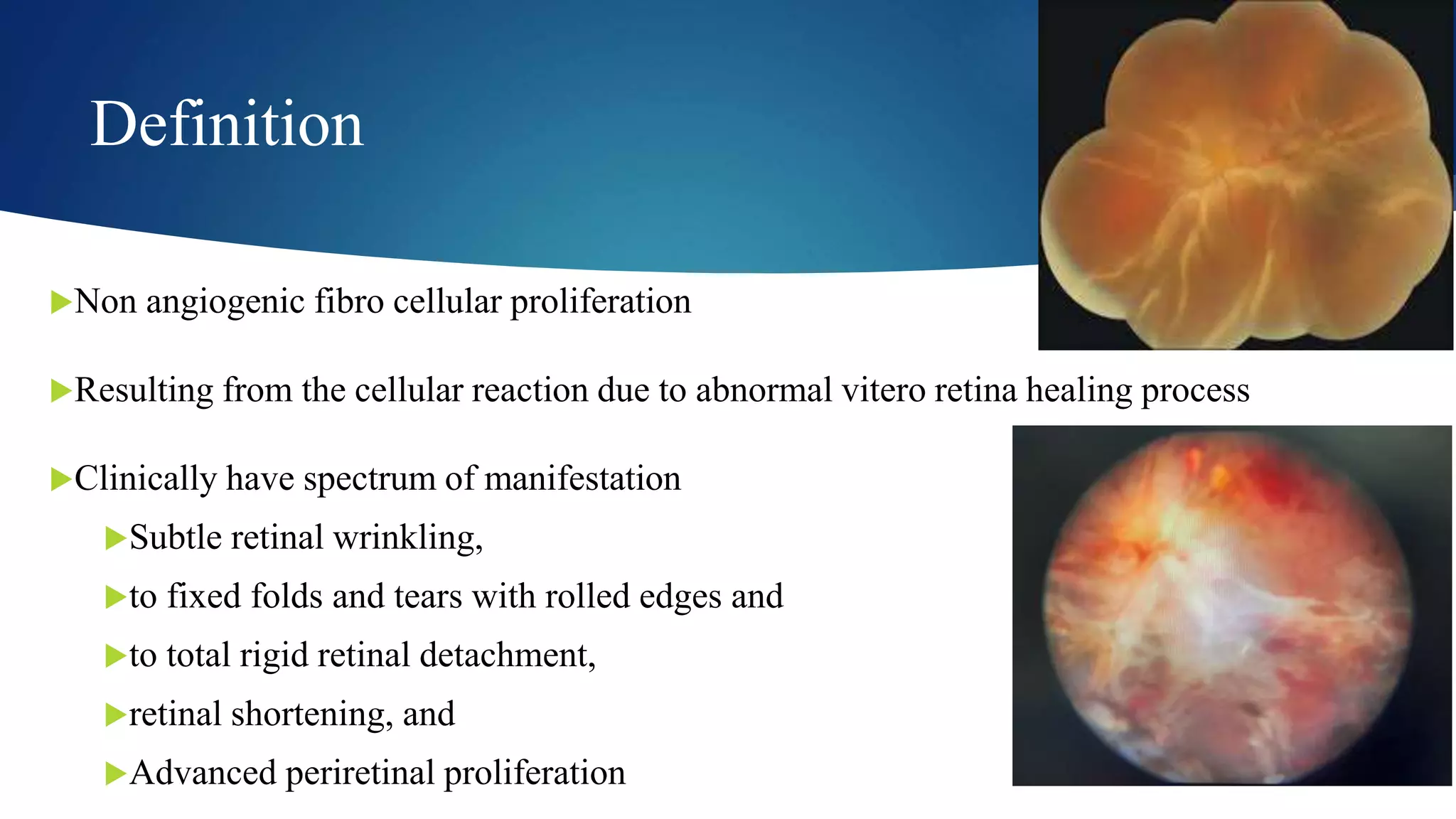 The clinical presentation of PVR can vary widely, ranging from subtle visual disturbances to profound vision loss. The severity and progression are often described using a staging system.