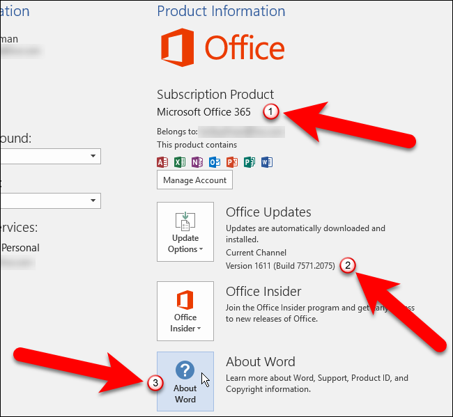 - About Outlook/Word/Excel: In some older versions, you might need to click on “About Word” (or the respective application name) within the “Account” section. This will open a new dialog box displaying the exact version, build, and sometimes even the product key.